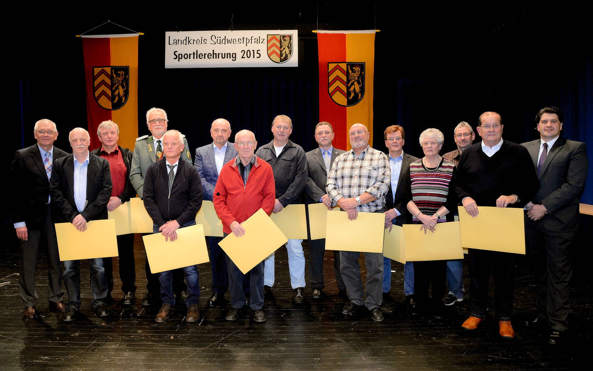 Das Bild zeigt die geehrten Sportförderer des Landkreises u.a. Günther Reichert (7 v.l.), Michael Leiser (8 v.l.) und Werner Laux (10 v.l.)
