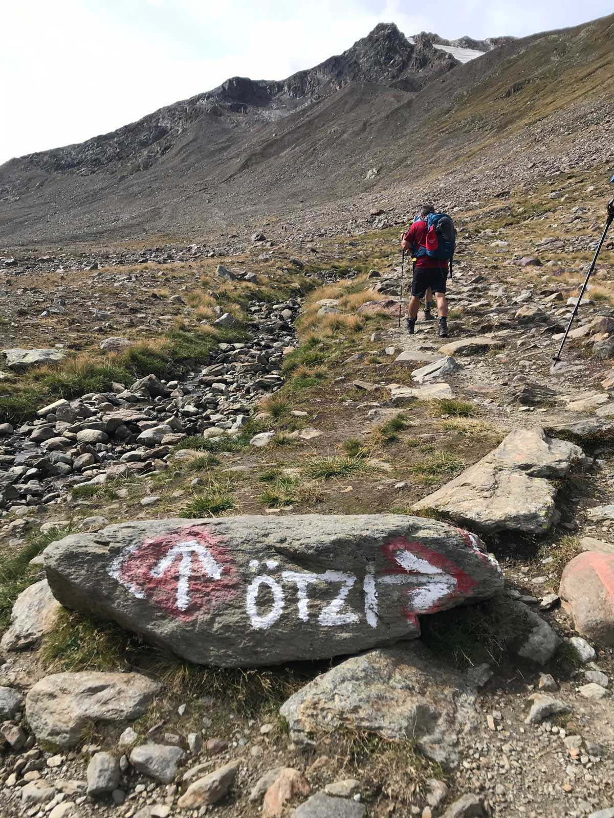 Tag 5: Gestärkt mit einem guten Frühstück, starten wir um 7:30 Uhr. Bei blauem Himmel, Sonnenschein und traumhaftem Blick ging es gleich hoch hinaus… genau auf 2.995 m, dem Pitztaler Jöchl, wo wir für eine Weile den Ausblick genossen. Von dort stiegen wir dann wieder ab, Richtung Skiarena Sölden, die zu dieser Zeit einer große Baustelle glich. (Kaum vorstellbar dass dort Ende Oktober der erste Skiweltcup stattfinden soll). Mit dem Shuttelbus gings anschließend durch den rd. 1,7 km langen Rosi-Mittermaier-Tunnel, der den Rettenbachferner mit Tiefenbachferner verbindet. Von dort starteten wir über den Ötztaler Höhenweg zu unserm nächsten Ziel nach Vent (1.900 m). Auf dem schmalen Pfad ging es entlang dem Mittelbergferner über Bäche und Brücken, vorbei am Weisseskar (See) bis wir nach 4 Stunden an unserm Etappenziel ankamen. Nach einem Ankunftsbier im Hotel Post gings weiter zu unserer Unterkunft ins Berghotel Gstrein wo wir herzlich empfangen wurden. Nach vier Tagen Hüttenkultur durften wir hier das versprochene, aber nicht daran geglaubte, Wellnessprogramm unseres Reiseführers erleben. Gute Betten, geräumige Zimmer, Warmwasserduschen, Sauna und ein hervorragendes Abendessen mit ein paar Aperol-Spritz rundeten den schönen Tag ab.
