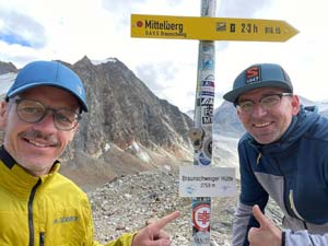 Am Morgen des vierten Tages erreichte uns noch vor dem Frühstück eine Hiobsbotschaft. Tom der sich 3 Monate auf diese Tour vorbereitet hatte, konnte aufgrund von Blasen an beiden Fersenballen, die er sich beim Abstieg am Vortag zugezogen hatte, die Wanderung nicht mehr fortsetzen. Die Entscheidung fiel ihm nicht leicht, aber aufgrund der bevorstehenden An-und Abstiege in den nächsten Tagen wohl die richtige. Nachdem wir uns von Tom verabschiedet hatten und ein letztes gemeinsames Gruppenbild machten, setzten wir unsere Tour zum nächsten Etappenziel der Braunschweiger Hütte fort. Zunächst in dichtem Nebel, dann in herrlichem Sonnenschein führte uns der Panoramaweg über Wiesen und Moorlandschaften an der Gogles Alm, Galflun Alpe und der Larcher-Alm vorbei Richtung Wenns. Von dort aus brachte uns der Postbus in das ca. 30 km entfernte Mittelberg, am Fuße des Pitztaler Gletscher. Um 13:30 Uhr starteten wir dann den etwa 3 stündigen Aufstieg zu der auf 2.759 m Höhe gelegenen Braunschweiger Hütte. Entlang des Weges durften wir uns noch über die Gletschergeschichte informieren, was uns alle etwas zum nachdenken brachte und wir uns die Frage stellten, wie lange es wohl noch die Gletscher gibt…? Vorbei am allseits bekannten „E5-Stein“ ging’s zum Pitze Wasserfall der aufgrund seiner Wassermassen sehr beindruckend war. Weiter über kleinere Klettersteige mit Seilsicherungen, kleine Pfade und herrlichen Aussichten auf den Gletscher erreichten die Ersten der Gruppe gegen 16:10 Uhr die Hütte. Nach einem ersten kühlen Bier und dem anbringen unseres Aufklebers traf auch der Rest der Truppe ein. Anschließend bezogen wir unser Zimmer (der Name des Zimmers kann an dieser Stelle nicht genannt werden) und gingen nach einer Dusche in den gemütlichen Teil über wobei wir mit „Schales“ (bei uns Grumbeerebrode) verköstigt wurden. Gegen 20:15 Uhr erreichte uns dann die Nachricht, dass Tom die Heimreise mit dem Zug gut überstand hat und mit einem Müller-Schorle in Gedanken bei uns weilt.