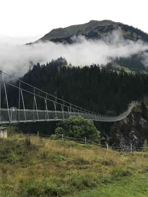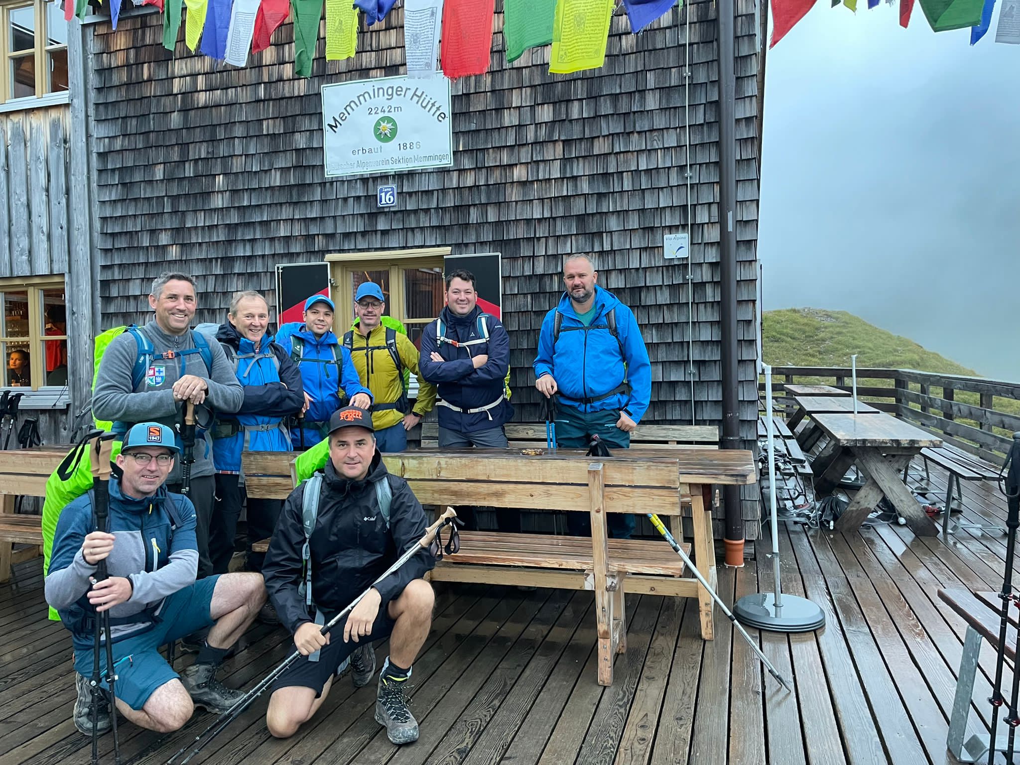 Weiter ging es am nächsten Morgen bereits um 7:00 Uhr. Ziel war die Memmiger Hütte. Nachdem wir kurz nach dem Start die Österreichische Grenze passierten, ging es Talwärts Richtung Holzgau. Vorbei an der Rossgumpen Alm, am Hanssens Wasserfall bis zur Hängebrücke in Holzgau. Die Überquerung der 200 Meter langen und 100 Meter hohen Brücke kostete einige große Überwindung. Aber letztendlich schafften alle den Gang über das Tal. In Holzgau angekommen, setzte der Regen ein der uns bis zur Memminger Hütte begleitete. Auf einer rasanten Fahrt brachte uns das Taxi Feuerstein in das Madau-Tal, wo wir den Anstieg zur Memminger Hütte in Angriff nahmen. Nach zwei stündigem Aufstieg erreichten wir unser zweitens Etappenziel auf 2242 m. Nach dem Abendessen und ein paar Bierchen sorgten wir mit lustigen Sprüchen im großen Bettenlager für ausgelassene Stimmung ehe um 22 Uhr die Lichter erloschen.