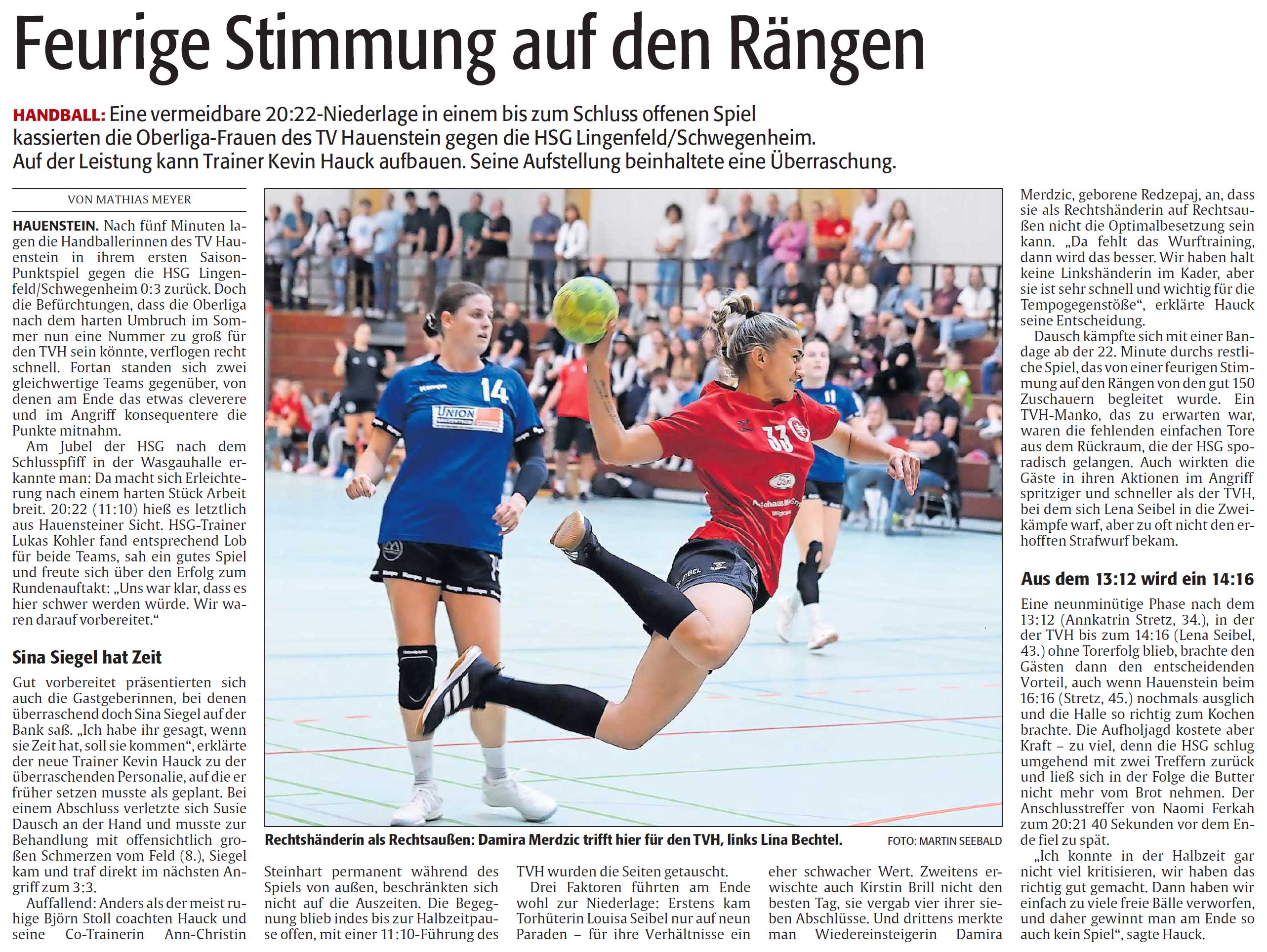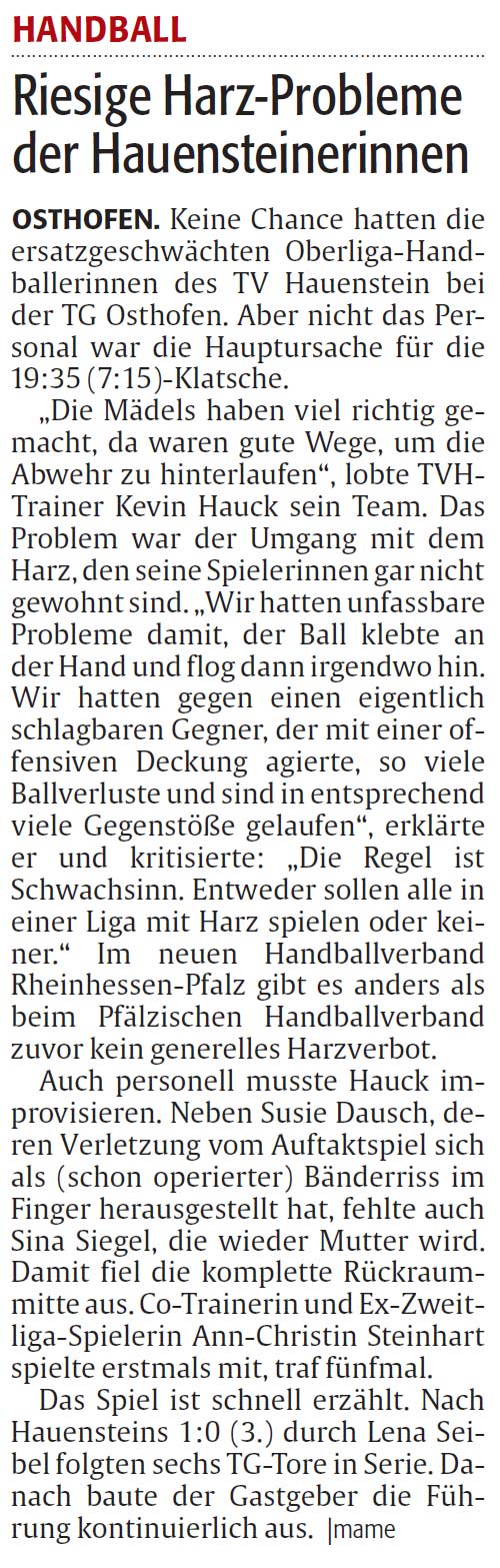 Handball, Bericht Rheinpfalz vom 20.09.2016: "TVH-Frauen stecken zwei Platzverweise weg"