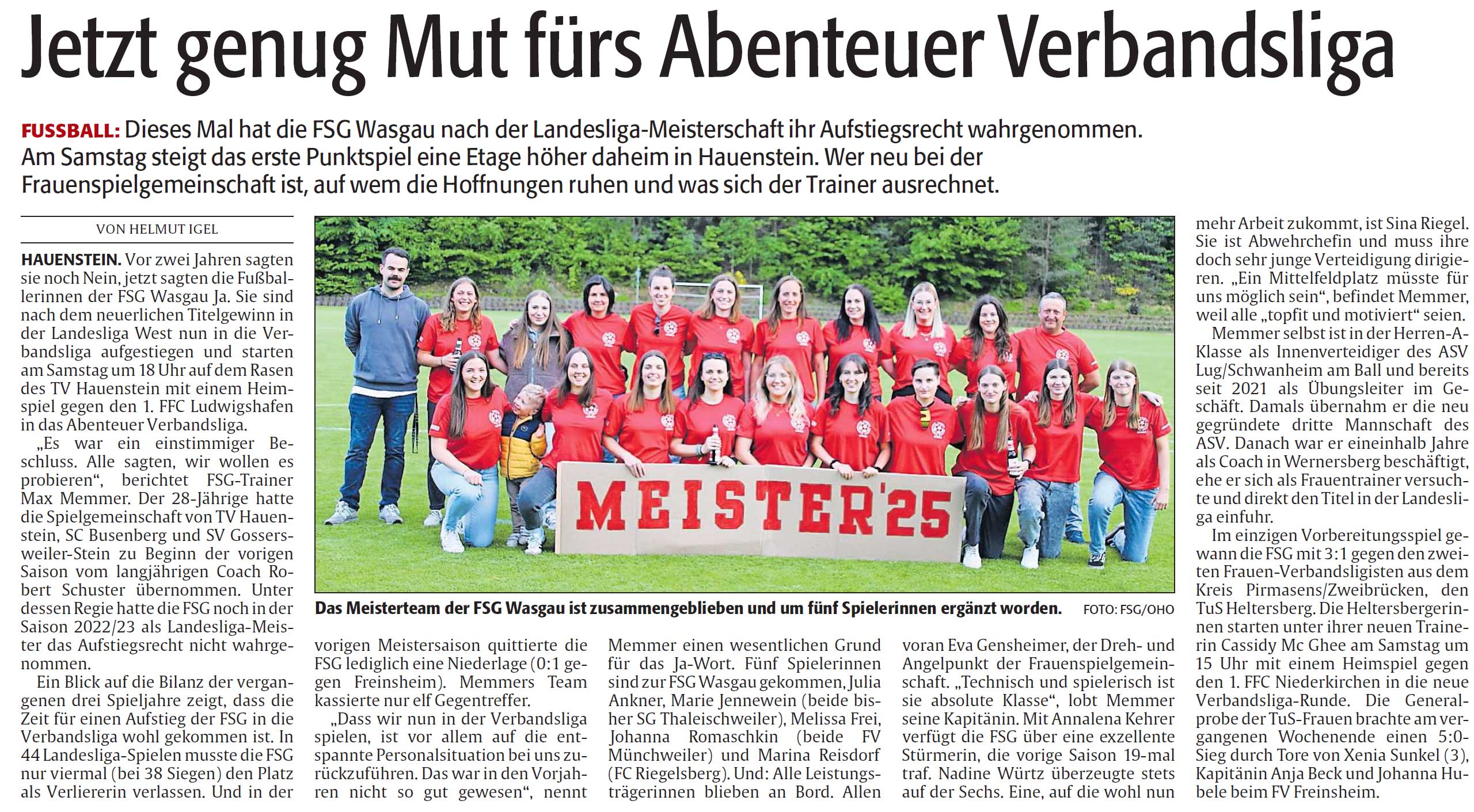 Fußball, Bericht Rheinpfalz vom 06.06.2015: "Hauenstein holt U16-Mädchen-Pokal"