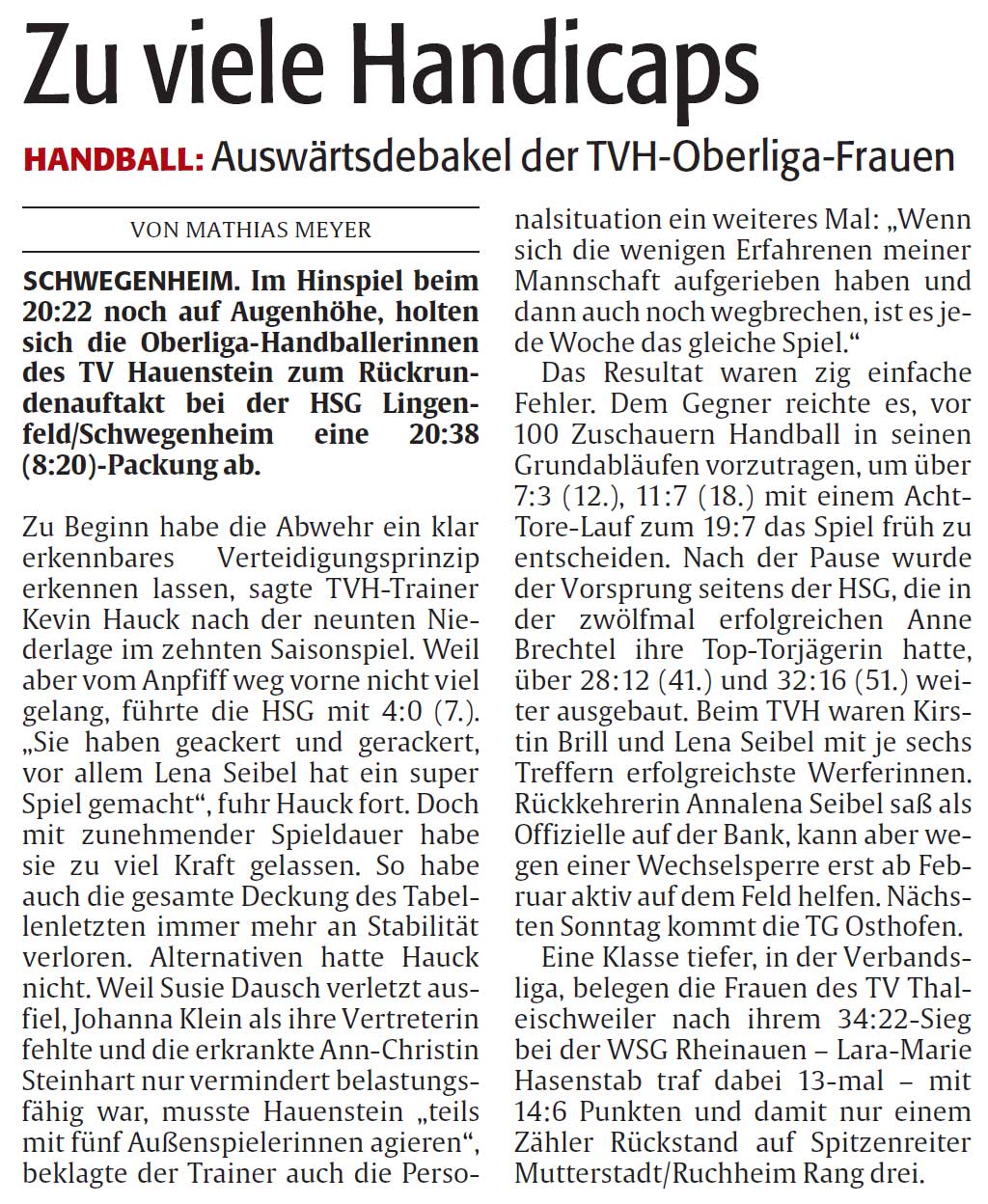 • Rheinpfalz vom 11.01.2013: "Heute Kaltstart der TVH-Frauen" (Handball)
