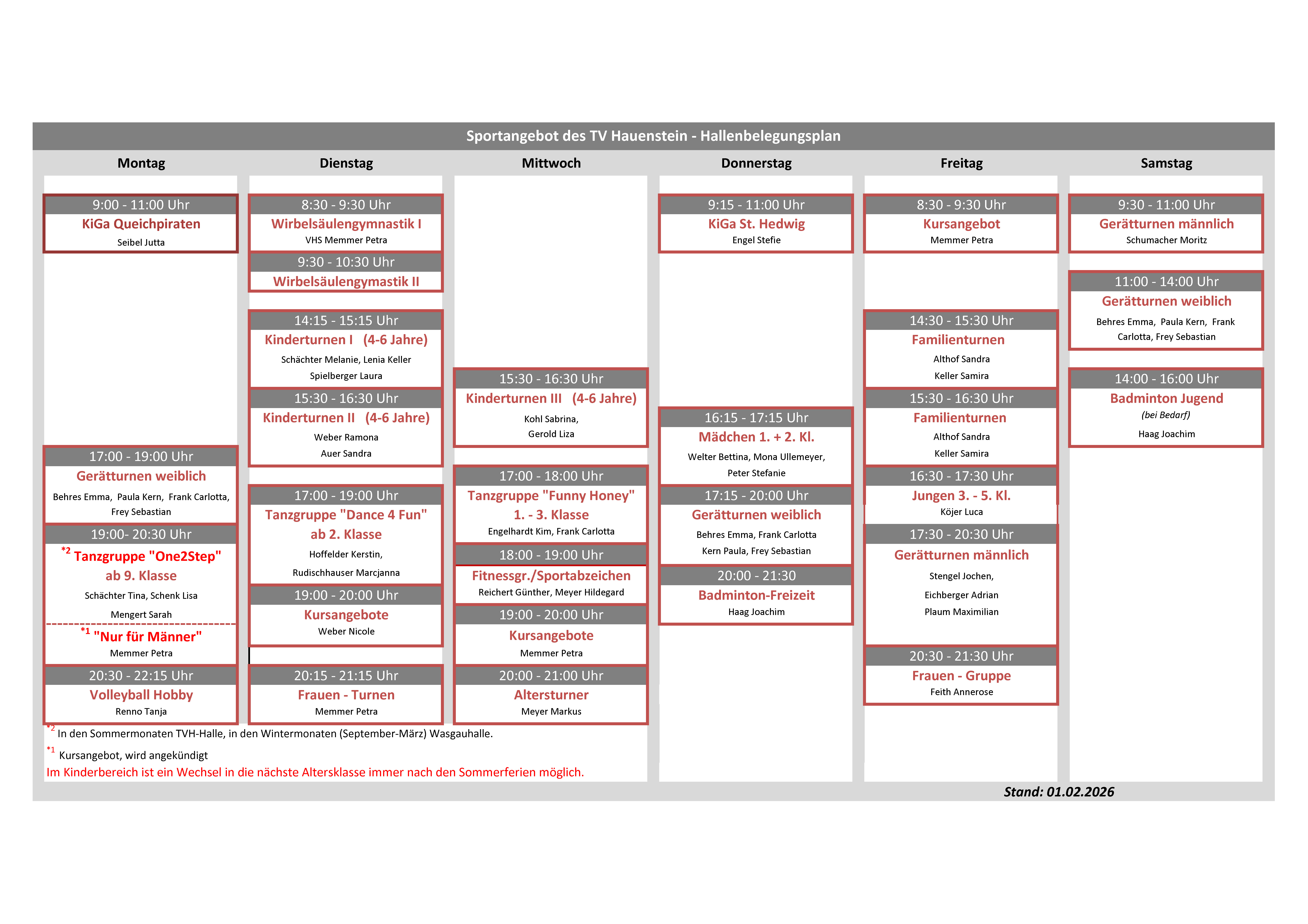 Nachfolgend das aktuelle Sportangebot mit allen Übungsstunden: